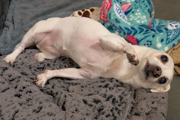 Miss Leela will happily spend her days wrapped in blankets, snoozing in your arms, or tucked into a comfy spot beside you. People are what makes her most happy. She's also wonderful with other dogs.Despite everything she's been through, Leela's gentle spirit shines.